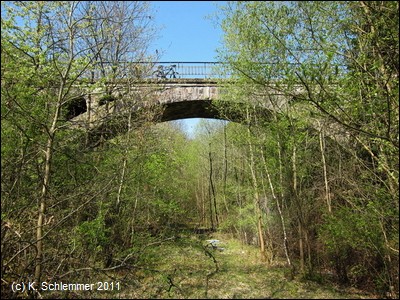 Blick auf die verlassene Bahnstrecke und das Viadukt, das noch gut erhalten zu sein scheint.