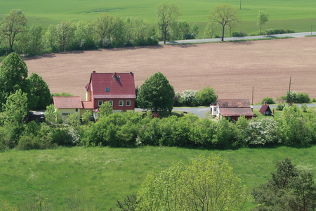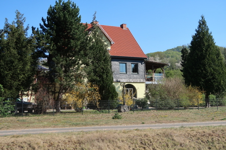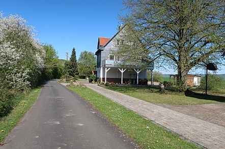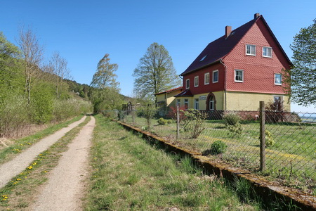 Nach Verlassen des Waldes nähert man sich dem Bahnhof Dieterode, heute als privates Wohnhaus genutzt. Weit oberhalb liegt die Abbruchkante des Muschelkalks der Dieteröder Klippen. Von dort oben erkennt man das ehemalige Bahnhofgebäude weit unten am Radweg.