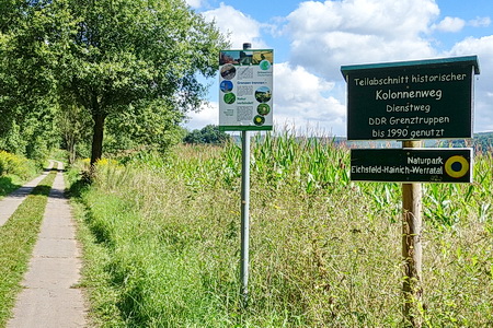 Vorbei am Bahnhof Großtöpfer erreicht man gemeinsam den Ort an der ehemaligen DDR-Grenze. Auch hier wurde der Radweg neu gestaltet. Die Bahnlinie von Heiligenstadt endete hier seit der Sprengung des Friedaviadukts 1945.