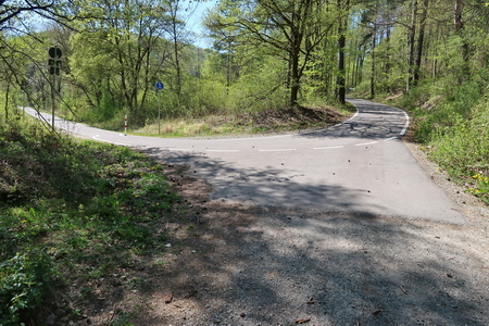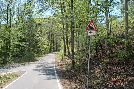 Der Feldweg führt nun hinab ins Tal und tifft dort südlich von Martinsfeld auf die Landstraße. Die steile, steinige Strecke ist alles andere als ein Radweg (Stand 2020), hier müsste dringend nachgebessert werden!