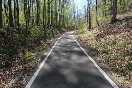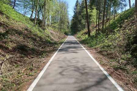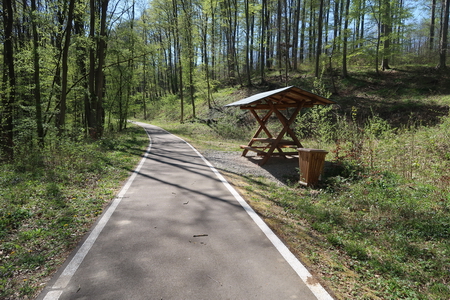 Am Rande des Radwegs findet man hin und wieder überdachte Rastbänke. Trotz des für eine Bahnstrecke recht kräftigen Anstiegs ist die Fahrt durch den Wald ein Genuss.