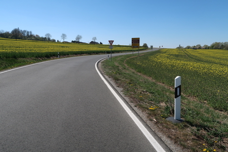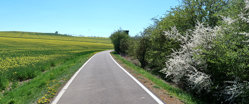 Der Radweg knickt nach links ab und mündet in die Landstraße. Die zugewachsene Bahntrasse führt weiter aufwärts durch die Felder. Ein kurzes Stück bis in den Ort Kalteneber muss man auf der Straße fahren, keine optimale Lösung z.B. für Kinder.