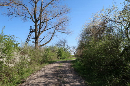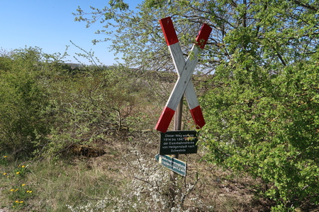 Wer der alten Bahntrasse folgen will, muss nach der Brücke rechts abbiegen und am zugewachsenen Einschnitt entlang, dann dem Pfad auf der Trasse folgen. Die Route war 2020 zugewachsen und für Normalradler nicht geeignet. Die neu beschilderte Wegführung durch den Ort führt durch die Felder weitab der Bahntrasse nach Ershausen.