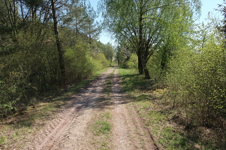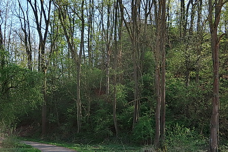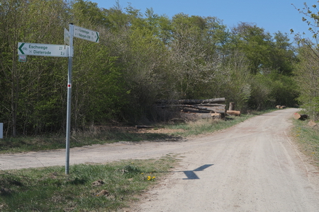 Durch das Industriegebiet, dann an den Feldern entlang Richtung "Neun Brunnen" führt der neue Radweg, der in diesem Abschnitt noch nicht die alte Bahntrasse nutzt. Schon bald ereicht man den Waldrand.