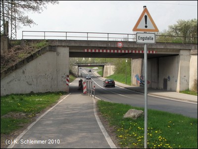 Den tiefen Einschnitt vor Gillenfeld überspannt eine Brücke. Ende des Radwegs auf der Trasse vor dem Ort, es folgt wieder eine kurze Umfahrung.