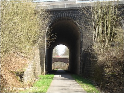 Jetzt geht es auf der Bahntrasse an Maring vorbei. Die Reste des ehemaligen Haltepunkts sind noch erhalten. Die Brücke der K58 überquert den Radweg.