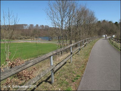 An einigen Straßenkreuzungen, hier mit der L16, wurde die Trasse zerstört. Vorsicht bei der Abfahrt und dem folgenden Anstieg auf die Trasse! Der Radweg führt direkt am Holzmaar vorbei.