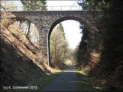 Wieder geht es unter der A1 hindurch, dann erreicht man den alten Bahnhof von Manderscheid-Pantenburg. Es folgt ein schönes Wegstück mit dieser tollen Brücke über einen Einschnitt.