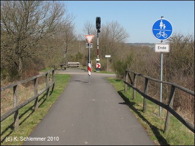 Hier sieht man die Beschilderung und die Warntafeln, die am gesamten Maare-Mosel-Radweg verwendet werden. Wir erreichen einen großen Parkplatz und den alten Bahnhof von Wittlich.