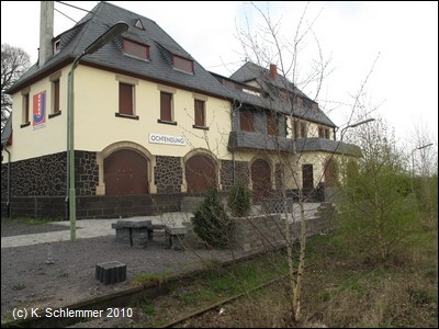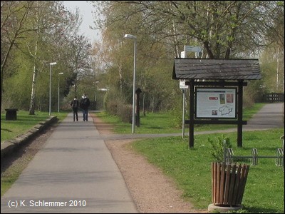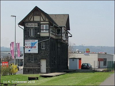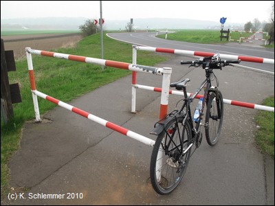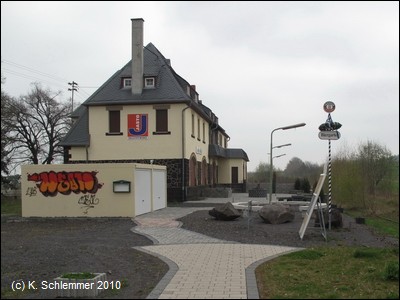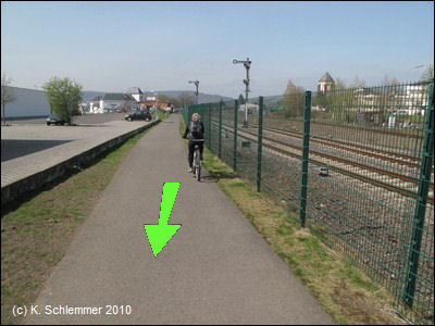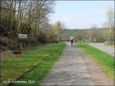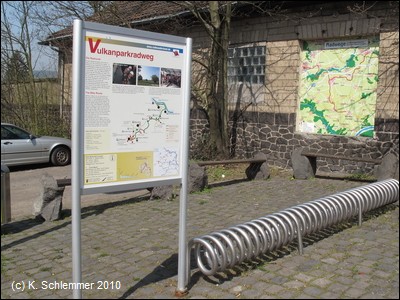 Am Bahnhof findet man (neben den ungeeigneten Fahrradständern - keine vernünftige Möglichkeit zum Anschließen) Informationen zum Vulkanparkradweg. An der Bahnstrecke entlang geht es stadtauswärts.