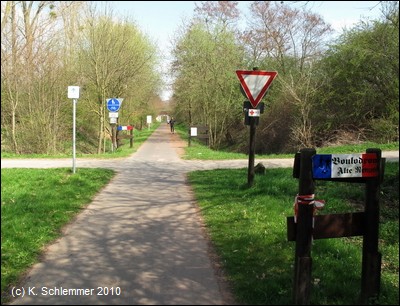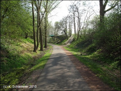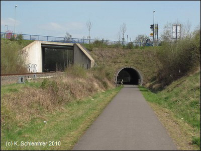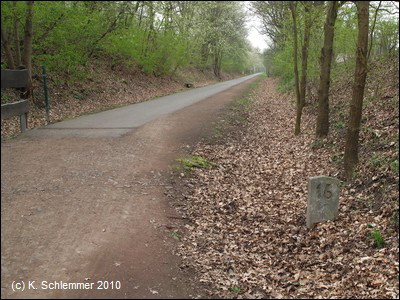 Dann geht es unter der Autobahn A48 durch. Neben dem Asphalt befinden sich in regelmäßigen Abständen Kilometerangaben, hilfreich für Läufer u.a.