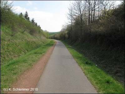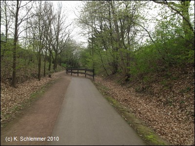 Durch ein parkartiges Gelände führt die Trasse zum alten Bahnhofsgelände. Noch gut 6 km nach Münstermaifeld.