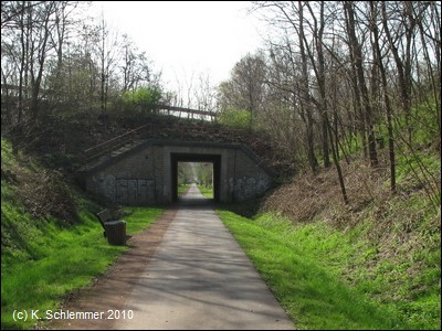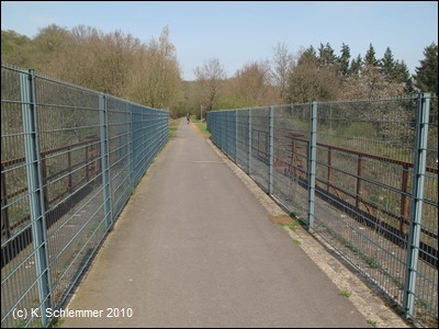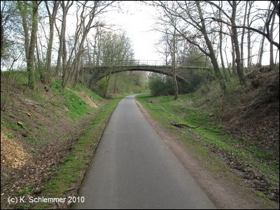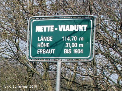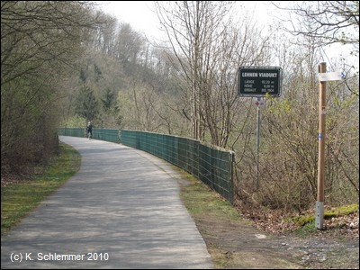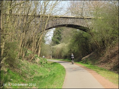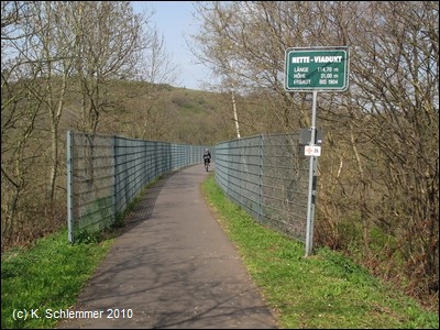 Weiter abwärts überspannt eine Brücke den Radweg. Dann erreicht man das mächtige Viadukt, das das Tal der Nette überbrückt.