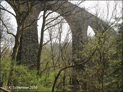 Das alte Bauwerk wurde mit recht unansehnlichen Gitterzäunen versehen, die den Blick versperren - schade! Vom Tal aus bekommt man eine Eindruck von der mächtigen Bogenkonstruktion.