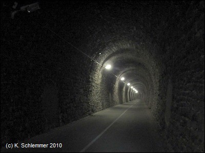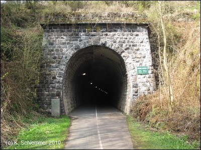 Dann kommt der erste (beleuchtete) Tunnel: Hausen 2, auf dem Schild am Portal steht: 252,95 m lang. Aus dem Tunnel heraus geht es über das Lehnen Viadukt (Blick Richtung Mayen), ein Bauwerk von 82,2 m Länge und nur 8 m Höhe.
