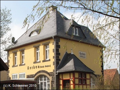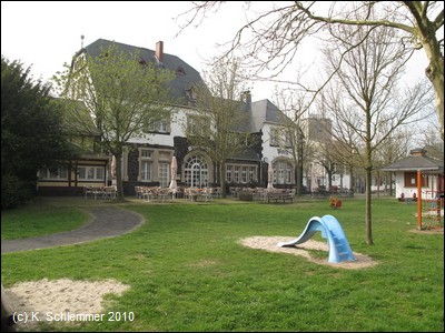 Das schön renovierte Gebäude ist bewirtschaftet, der parkartige Vorplatz ist kinderfreundlich mit Spiegeräten ausgestattet. Wir folgen den Wegweisern Richtung Kerben.
