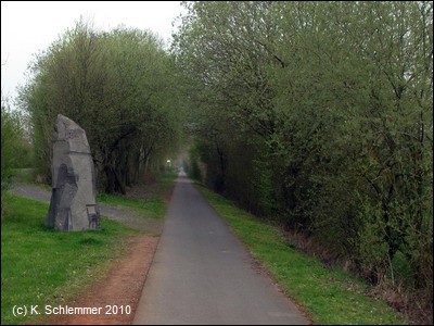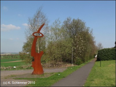 Auf dem Damm neben dem Radweg wurde eine weitere Skulptur installiert. Wir sind nun unverkennbar auf der Bahntrasse.