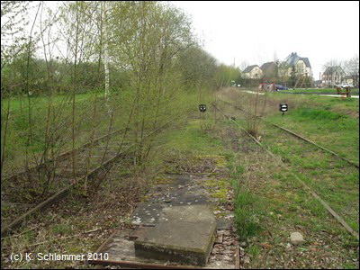 Hier liegen noch Gleisreste zu Erinnerung an die Bahnstrecke. Vorbei am Bahnübergang geht es zum alten Bahnhof.