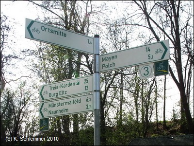Kurz nach dem Bahnhof Polch trennen sich die beiden Strecken: rechts ab Richtung Mayen, geradeaus Richtung Münstermaifeld. Die kurzen 10 km bieten entspanntes Radeln, ohne Steigungen, ohne Autosverkehr. Auch Inliner nutzen diesen Abschnitt gerne. Großartige Bauwerke gibt es auf diesem Abschnitt nicht, aber Münstermaifeld lädt zu einem Abstecher ein.