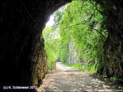 Der Zugang zum seitlichen Fenster-Durchbruch in diesem Tunnel ist vergittert. Nach dem Tunnel ist der felsige Abschnitt zu Ende (Blick zurück).