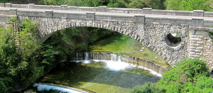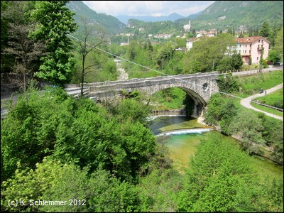 In einer Kurve geht es auf Arsiero zu, zunächst über eine gemauerte Brücke, dann über ein Stahlträgerviadukt über den Fluss Posina.