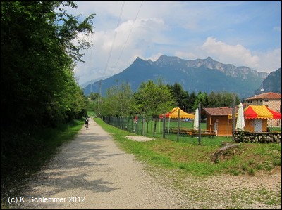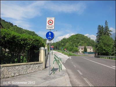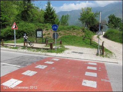 Noch vor Erreichen der Brücke über den Astico-Fluss links von der Straße abbiegen (Via A. Rossi). Die SP79 wird überquert. Hier beginnt der Radweg.