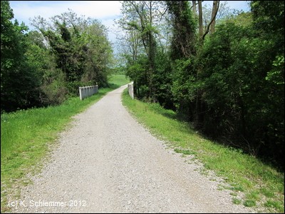 Auch ein Parkplatz mit Zugang zum Radweg liegt an diesem Streckenabschnitt. Das Streckenhäuschen (Casello No. 6?) ist in einem desolaten Zustand, der Dachstuhl ist eingestürzt.