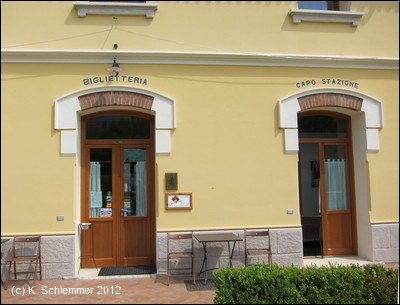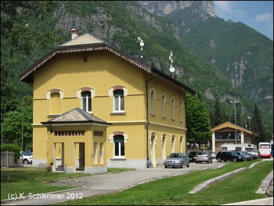 Bahnhof Seghe/Velo d'Astico, heute ausgebaut zum Restaurant. Noch zu lesen: Fahrkartenschalter und Eingang zum Stationschef.