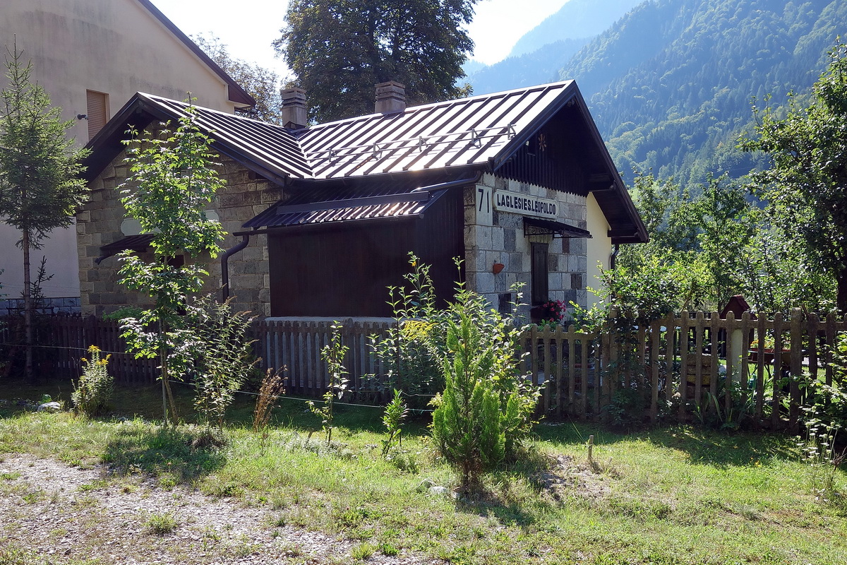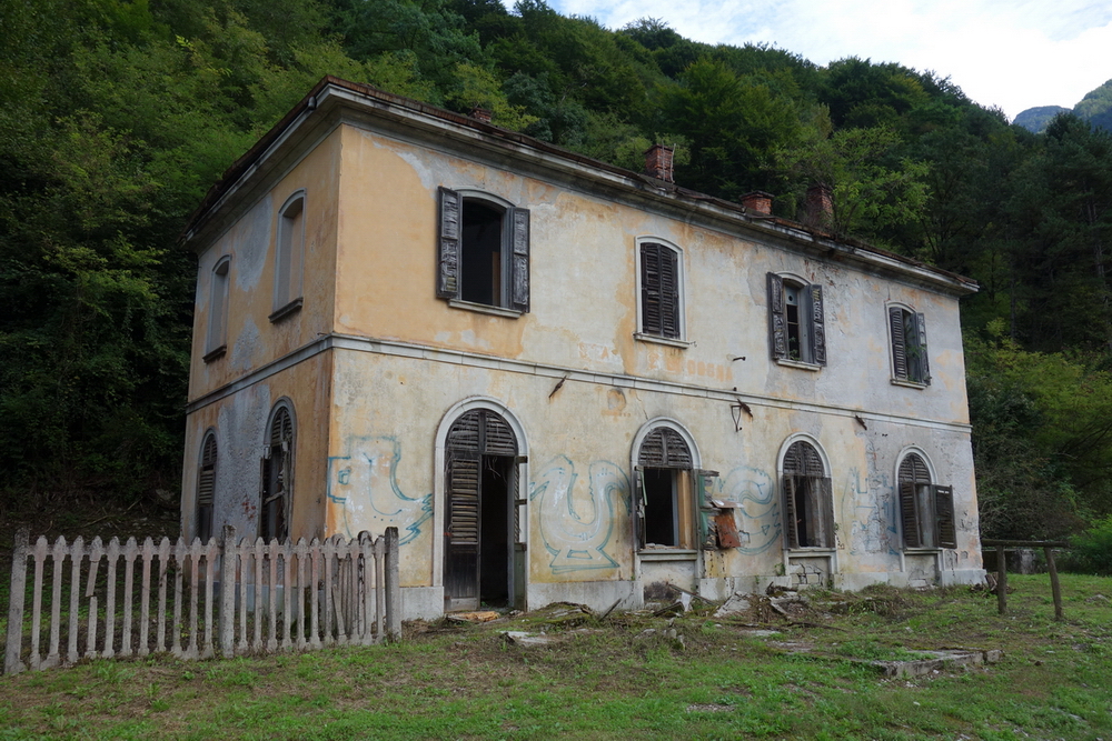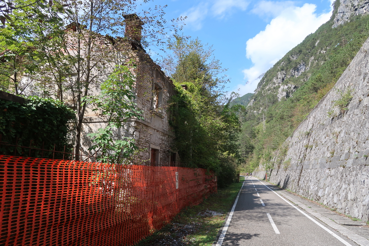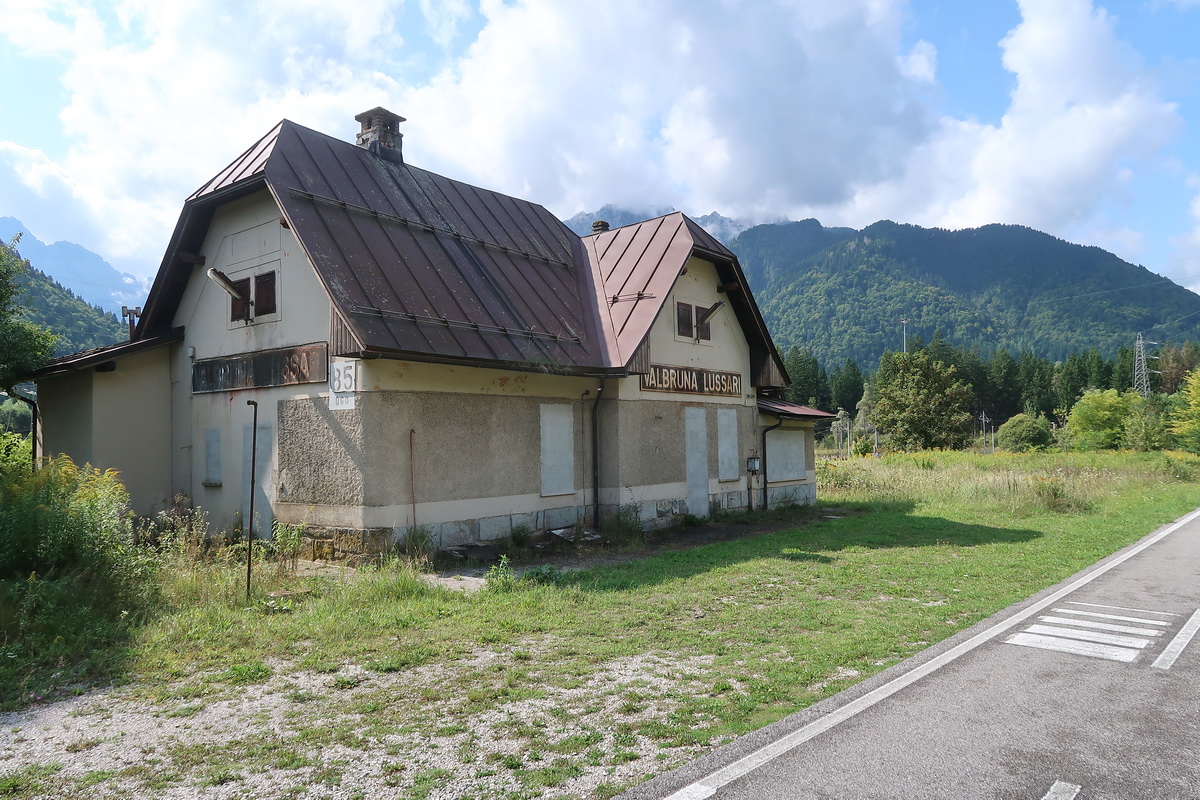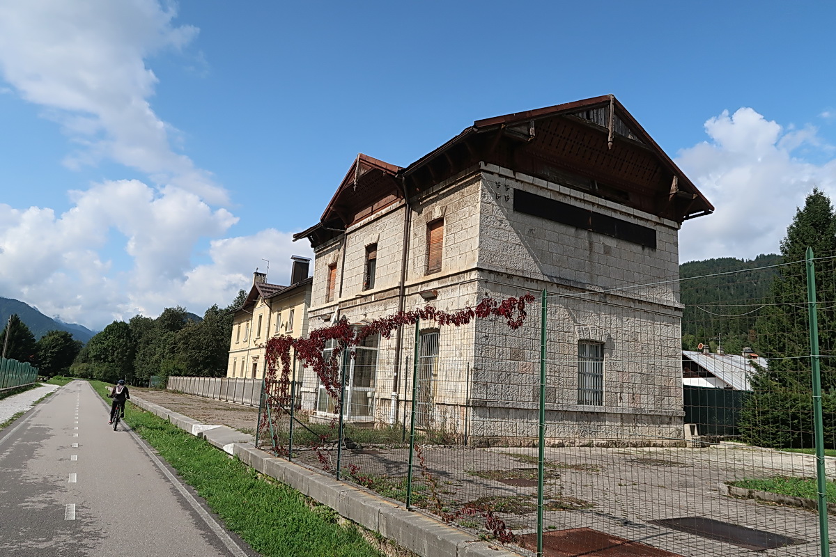 Reichlich Sperren, aber wenigstens rund und mit weitem Abstand. Es geht vorbei am alten Bahnhof Valbruna Lussari, das Gebäude hat schon bessere Zeiten gesehen.