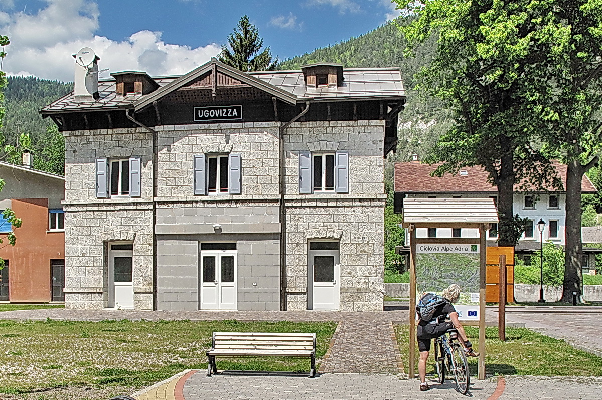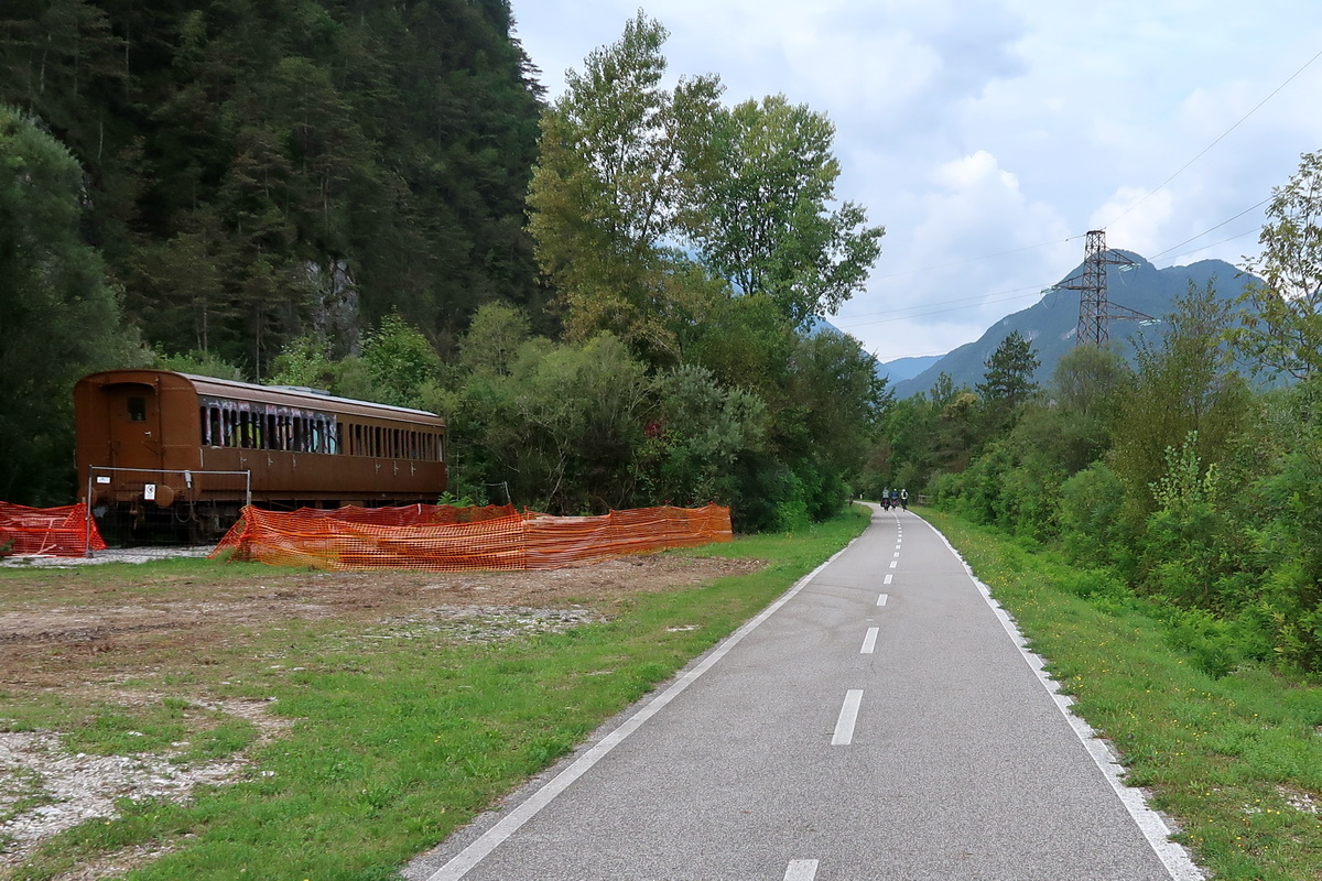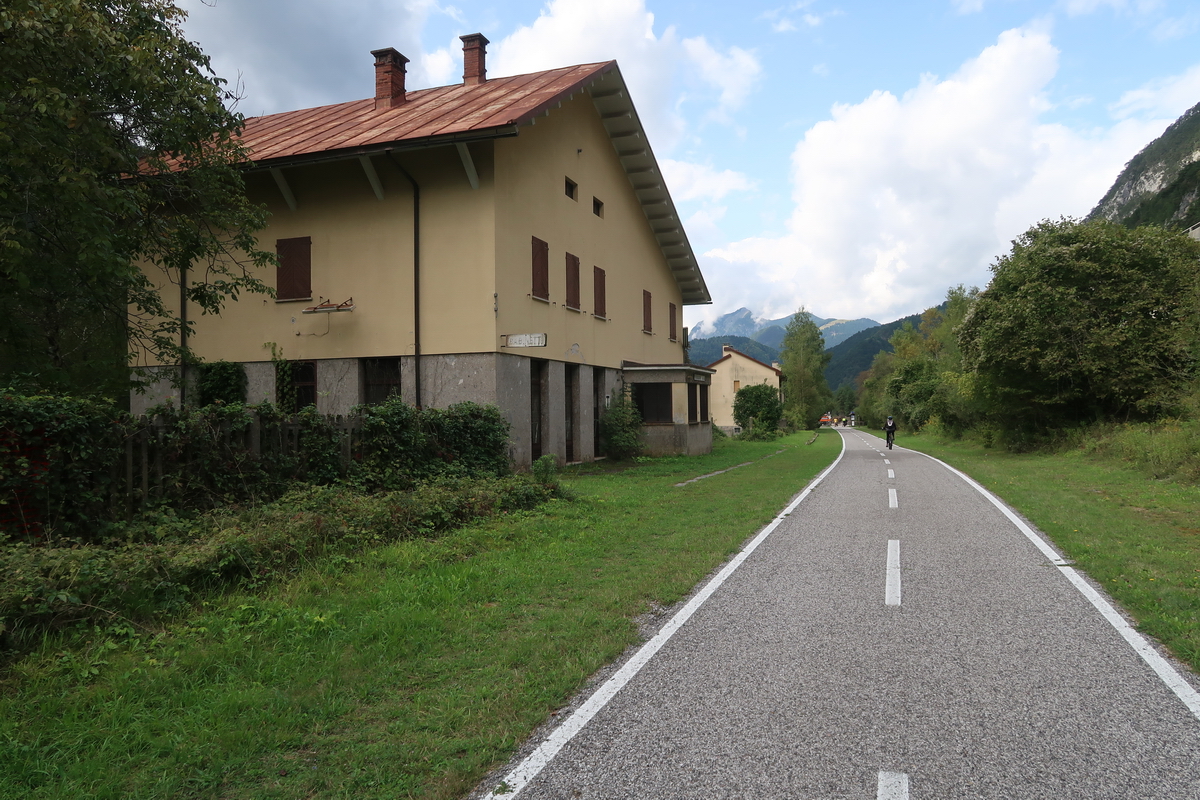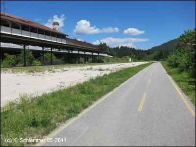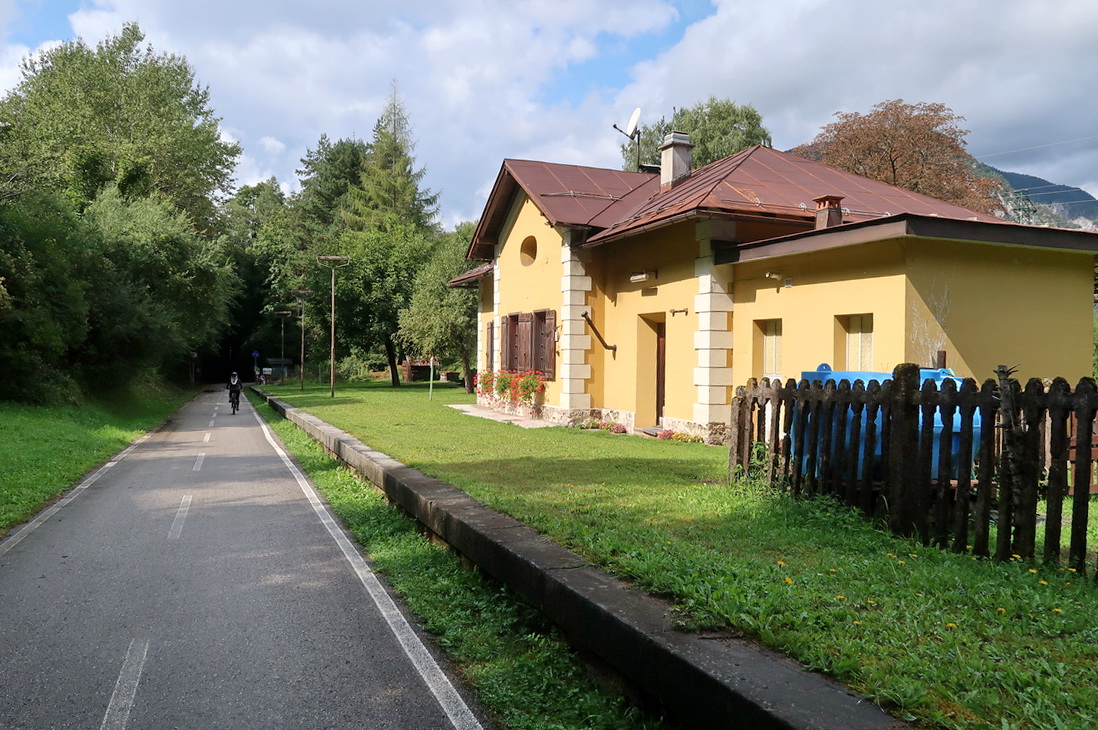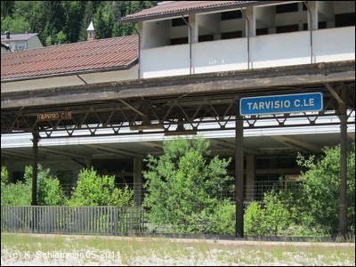 Der Alpe-Adria-Radweg aber führt geradeaus weiter zum verlassenen Bahnhofsgelände von Tarvisio Centrale. Das große Bahnhofsgelände des früheren Grenzbahnhofes ist verwaist und leer. Heute hat der Bahnhof Tarvisio Boscoverde an der neuen Bahnstrecke seine Funktion übernommen.