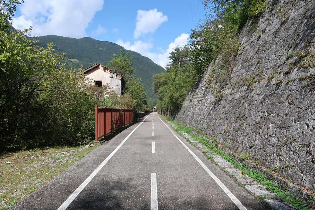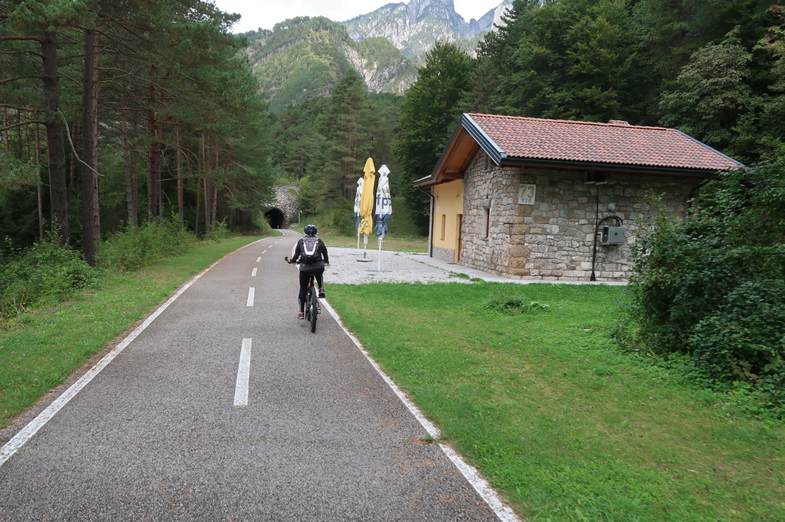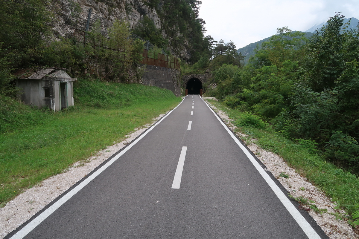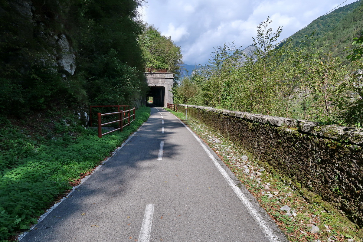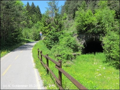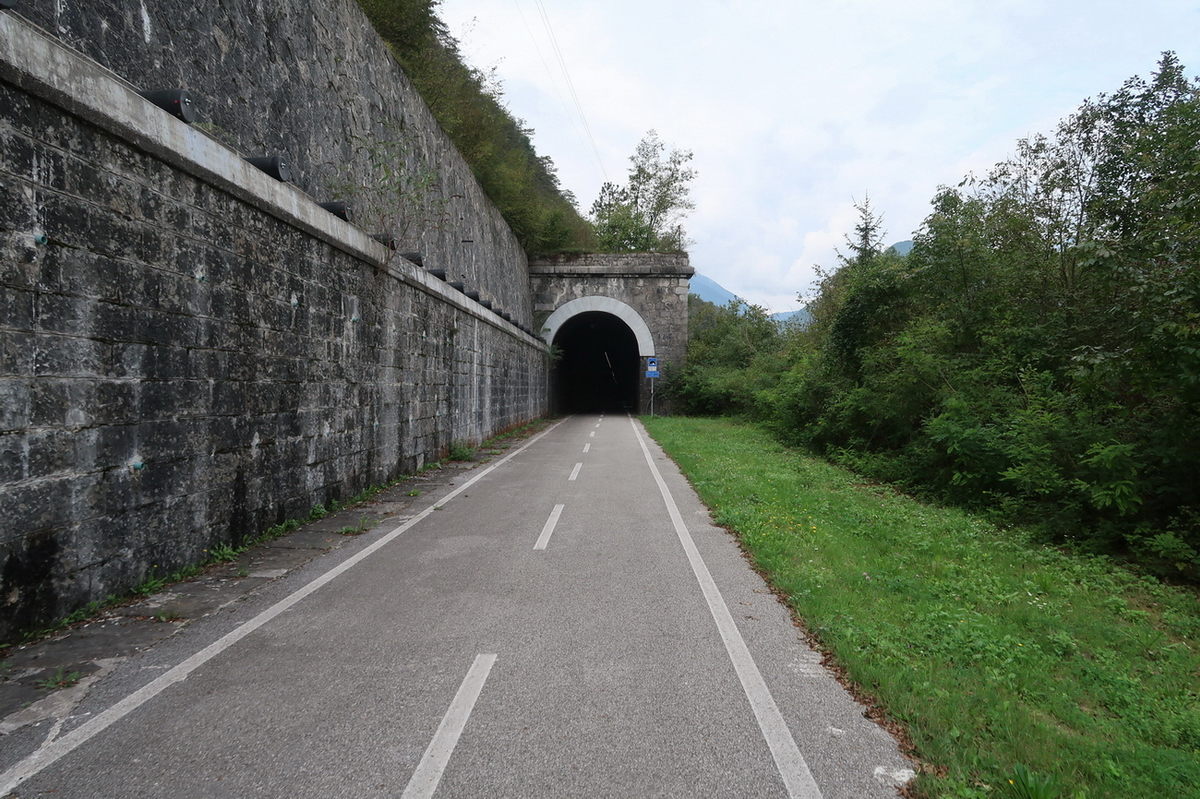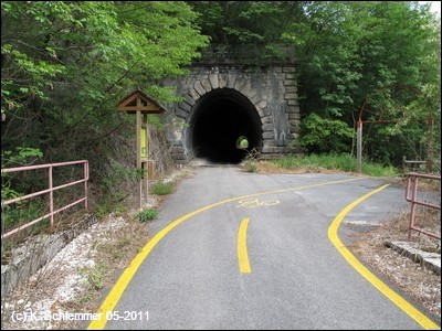 Nach ein paar hundert Metern ist das Ende des Radwegs auf der Bahntrasse erreicht. Der fast zugewachsene Große Goggauer Tunnel Richtung Österreich (517 m) ist nicht befahrbar, der Alpe-Adria-Radweg führt über den Pass von Coccau.