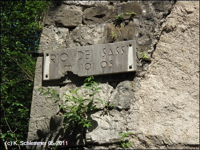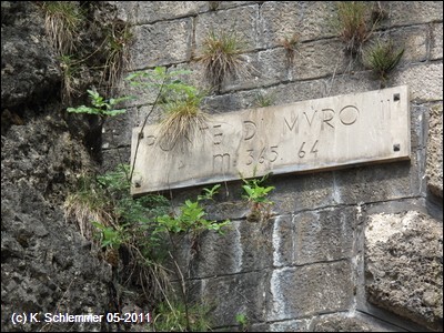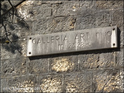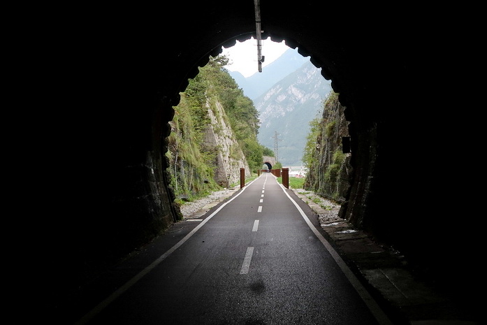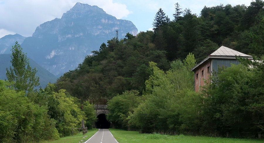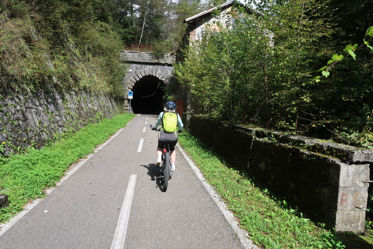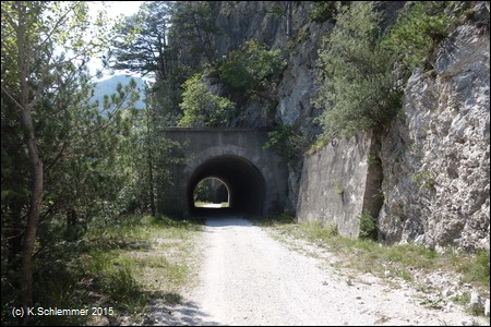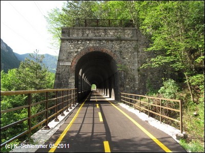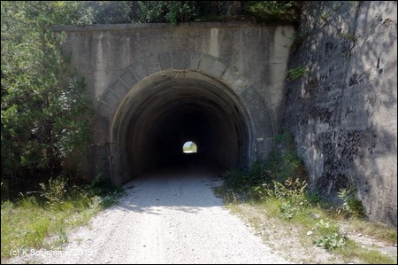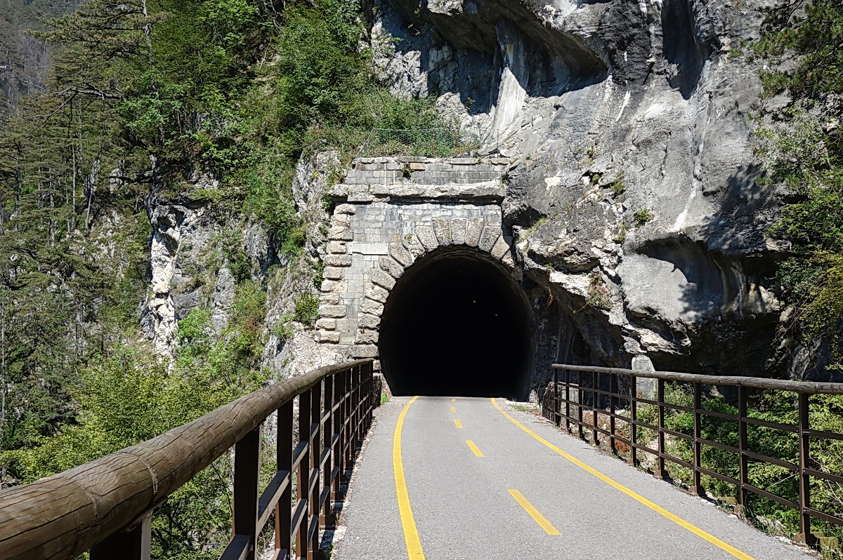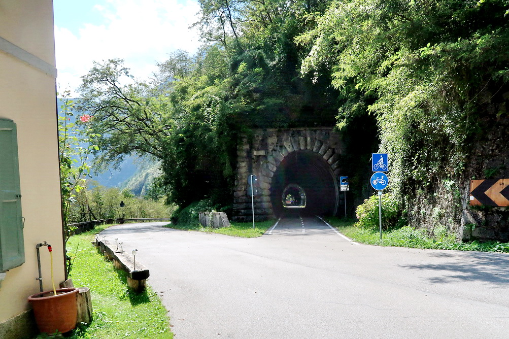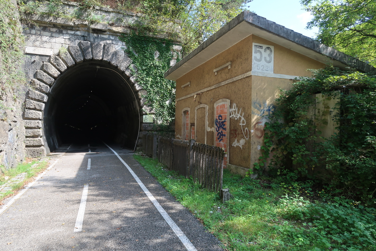 Der Höhepunkt des neuen Abschnitts: Tunnel Cinque Rivi, 942,88 m lang (steht auf der verblichenen Tafel am Tunneleingang)