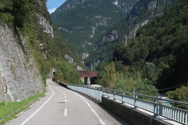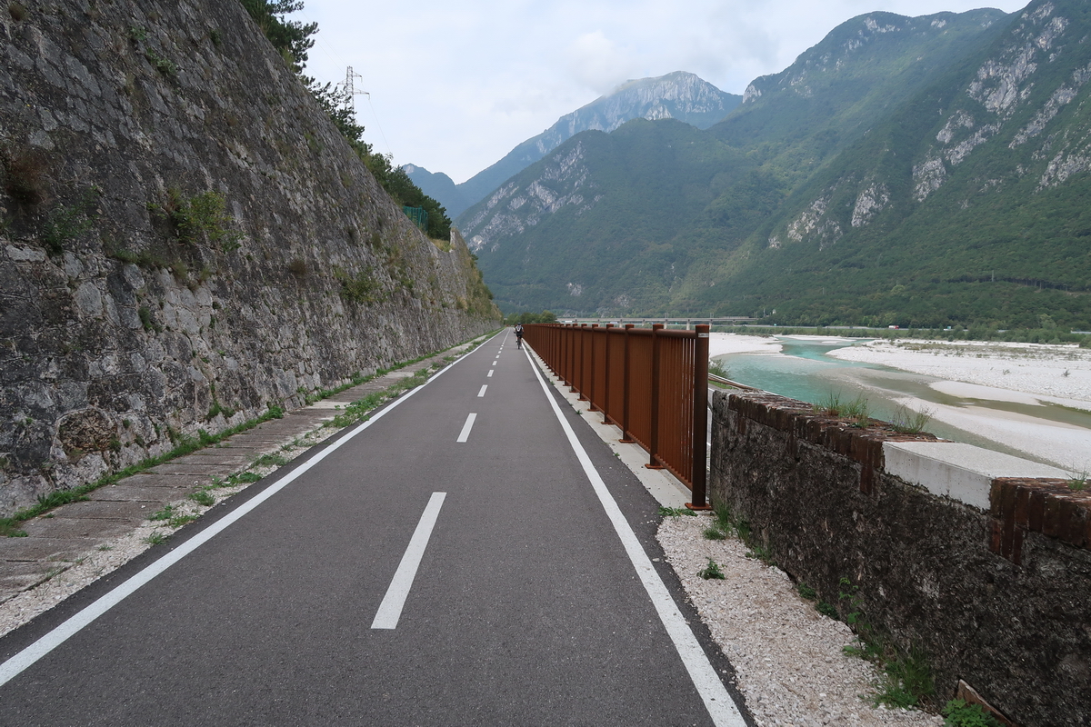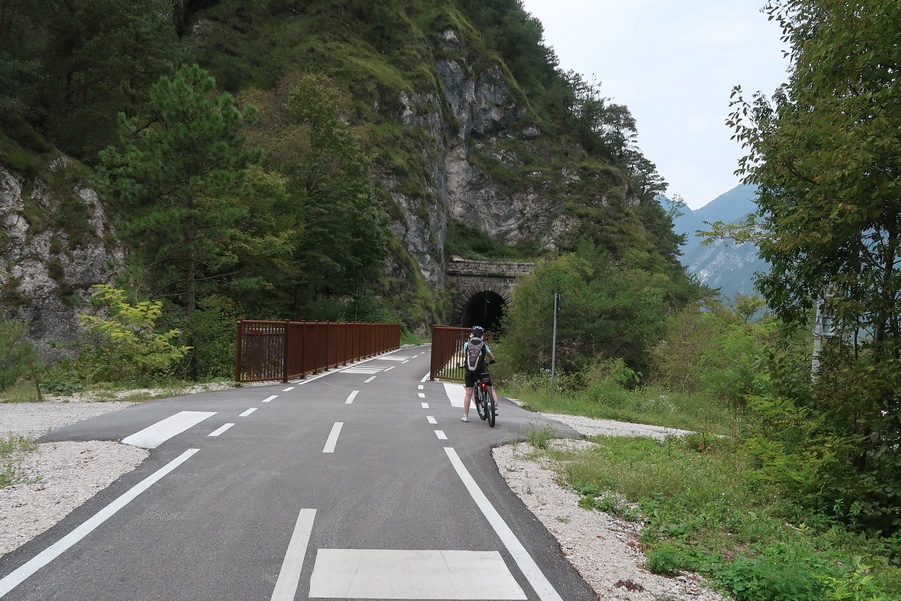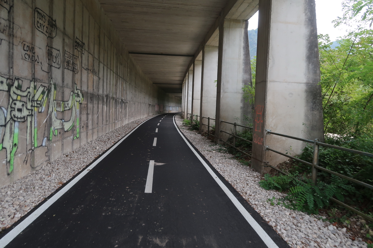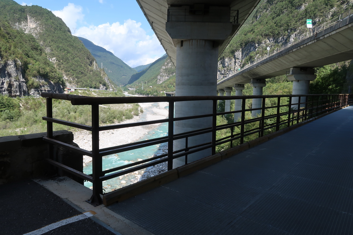 Auf der anderen Flussseite unterquert man zunächst die Alpe-Adria-Autobahn A23, dann die SS13. Danach geht es rechts ab auf den Weg leicht aufwärts am Fluss entlang. Die neue Pontebba-Bahnstrecke (Pontafelbahn) überkreuzt den Radweg und verschwindet in einem fast 5,6 km langen Tunnel, aber auch die Radler haben einige (allerdings viel kürzere) Tunnel vor sich.