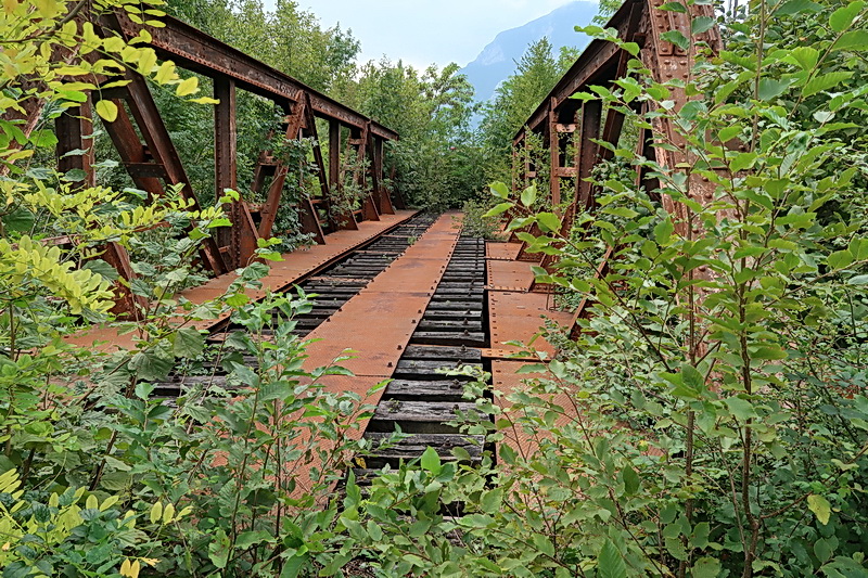 Blick auf die Berge,. Am Rande der Bahntrasse verbergen sich alte Fabikgebäude.