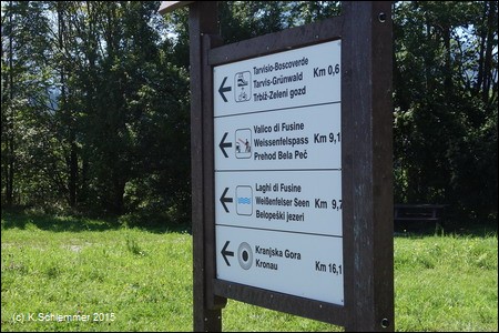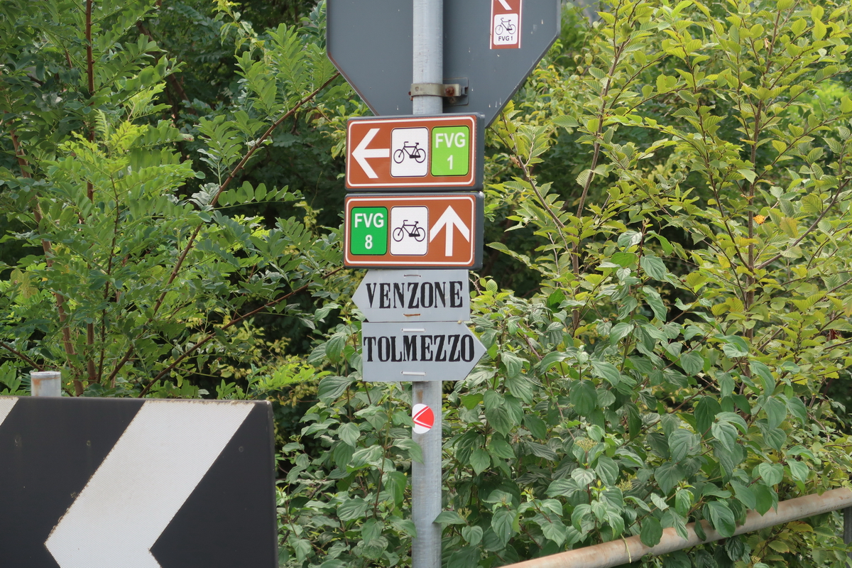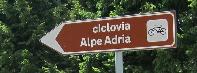 Die Wegweiser des Alpe-Adria Radwegs begleiten uns auf der Fahrt nach Tarvisio.