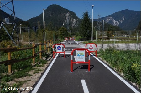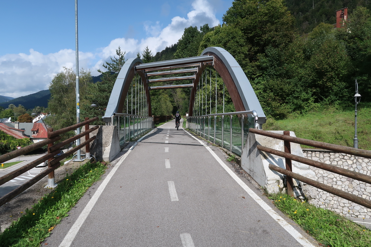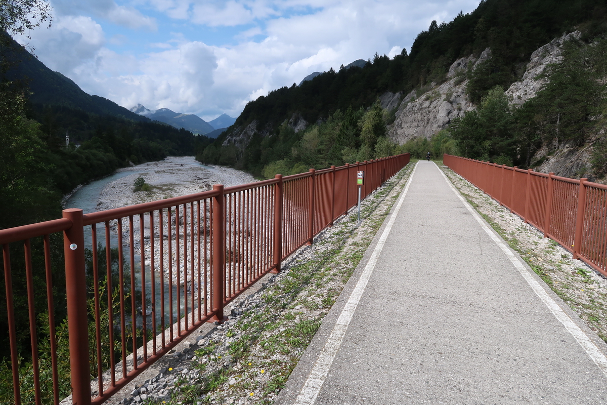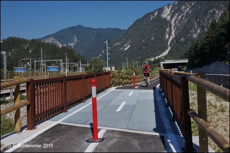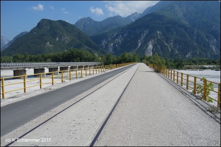 Auch die aktive Bahnstrecke überkreuzt den Radweg. Auch eine neue kurze Brücke über die Fella, hier noch ein kleines Gewässer, wurde notwendig.