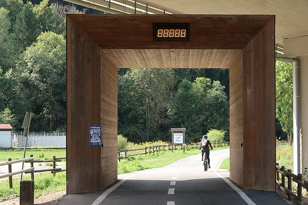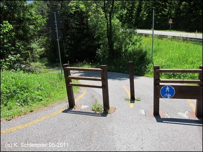 Auf der andere Straßenseite befinden sich ein überdachter Rastplatz und eine Infotafel. Nach etwa 1,6 km erreicht man den Scheitelpunkt der Strecke kurz vor der Unterquerung der A23. Das GPS-Gerät meldet 824 m ü.NN. Noch einen Kilometer weiter, an der nächsten Unterquerung, steht eine "Radlerzählmaschine", immer noch, oder schon wieder ohne Funktion (?).
