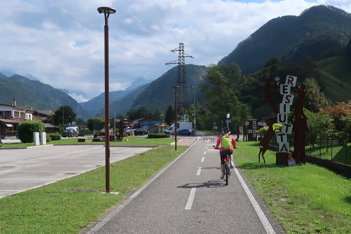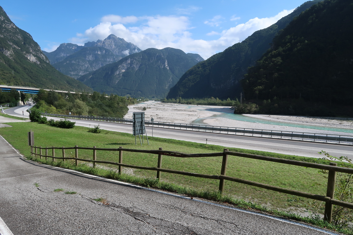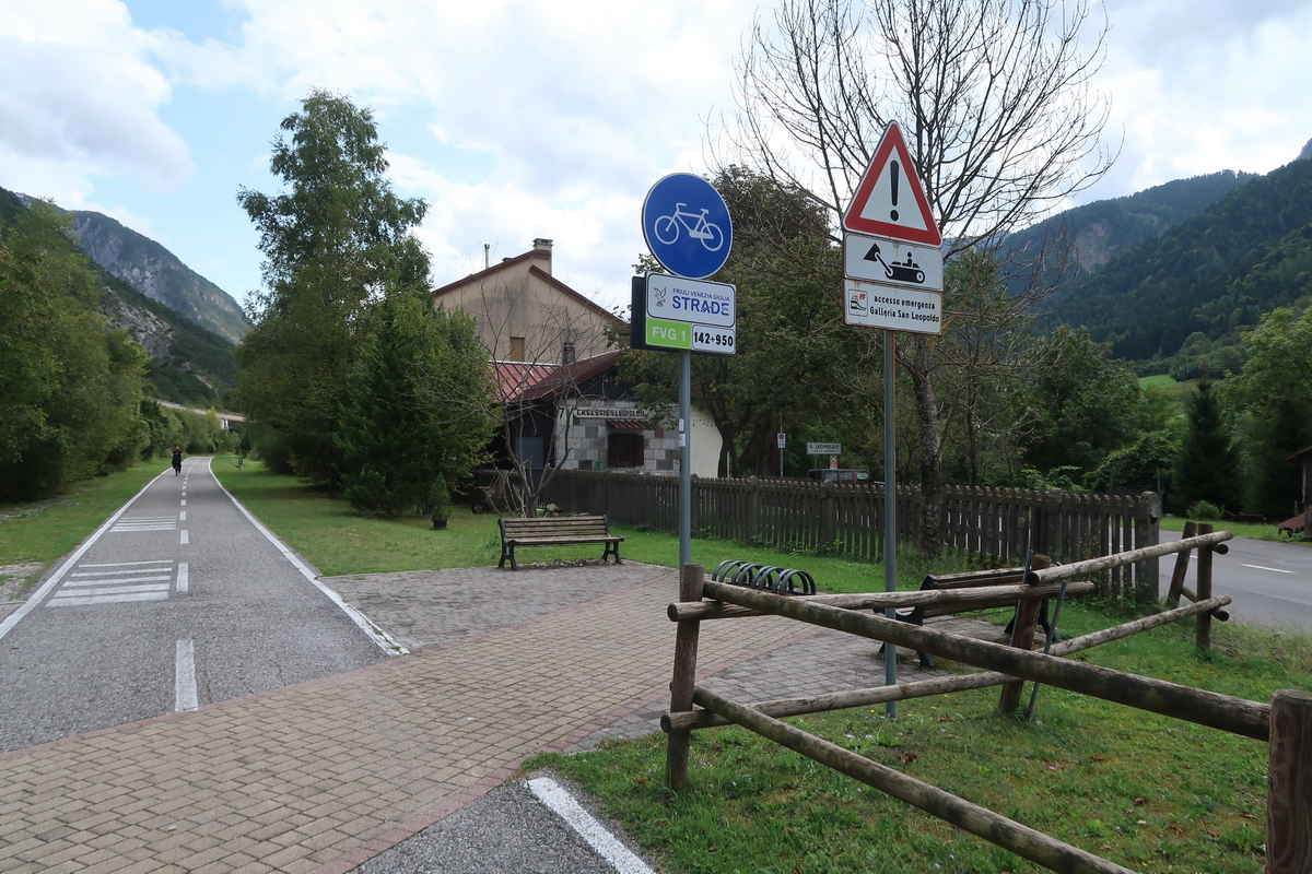 Das ab Pontebba recht breite Tal der Fella biegt nun Richtung Osten ab. Der Radweg am Ortsausgang verläuft direkt neben der Staatsstraße aufwärts. Das Tal ist hier stark von Brücken überbaut. Der Abschnitt ist auch hier mit den Wegweisern des Alpe-Adria-Radwegs beschildert.