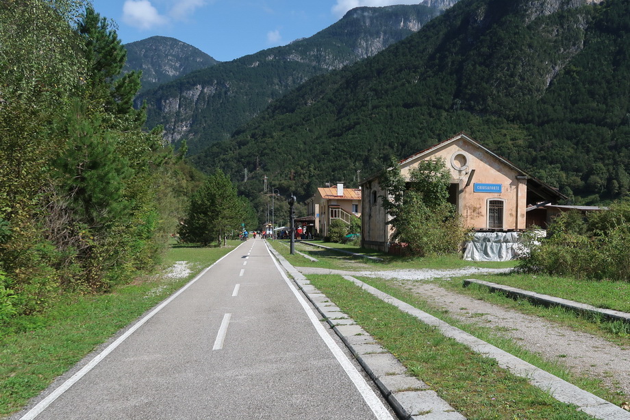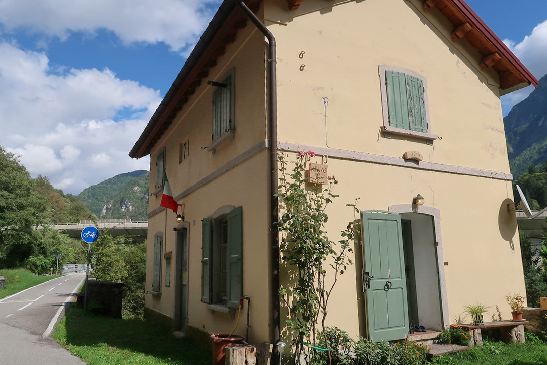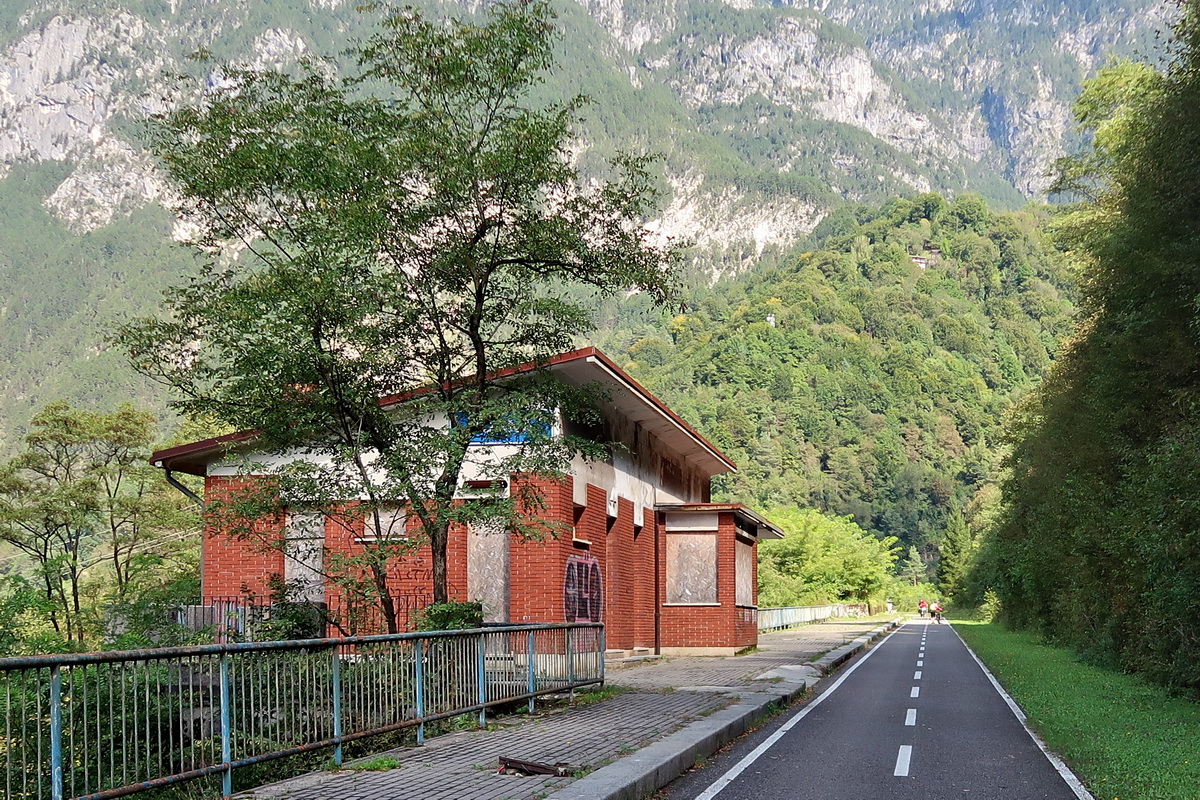 Der Bahnhof Chiusaforte wurde zum Bistro umgebaut, und viele Radler nutzen das schöne Eisenbahnambiente zu einer Rast. Ein Blick zurück zum Bahnhof, vorbei an dem alten Wasserkran für die Dampfloks.