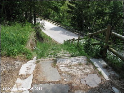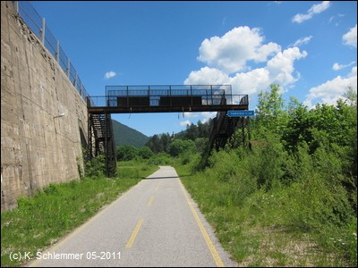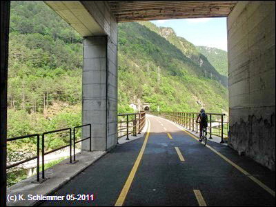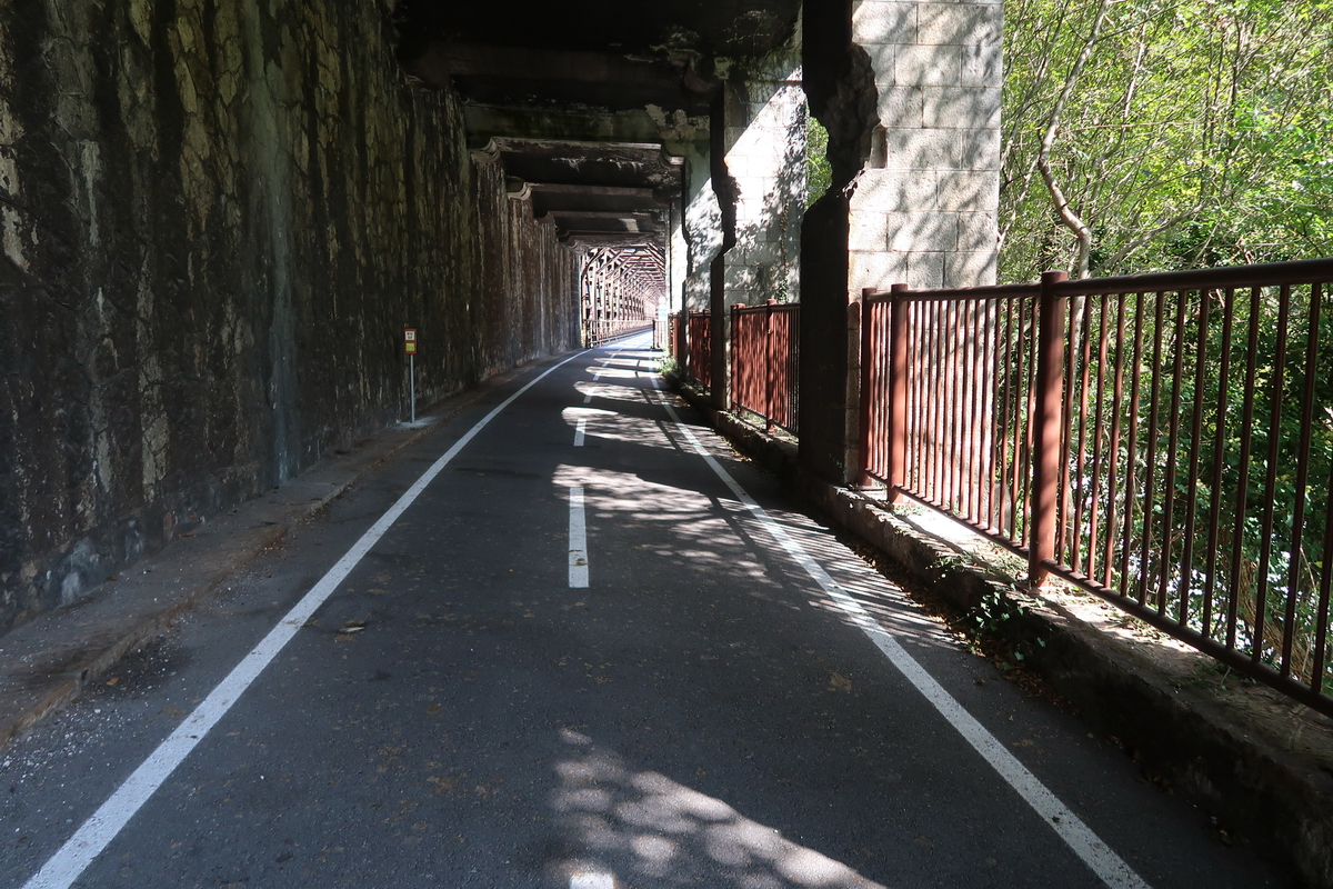 Im Jahr 2011 waren die beiden folgenden Tunnel noch nicht ausgebaut, Die Umgehung führte über eine Treppe hinab auf eine Nebenstraße. Das Viadukt am Streckenposten war ebenfalls nicht befahrbar. Diese Unterbrechungen waren 2025 beseitigt.