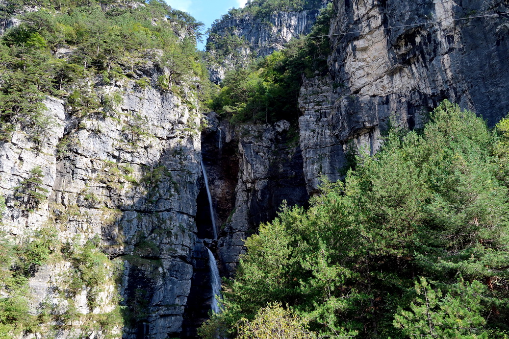 Dazwischen Ausblicke auf eine wilde Berglandschaft, hier mit Wasserfall. Das Tunnelportal sieht neu aus.