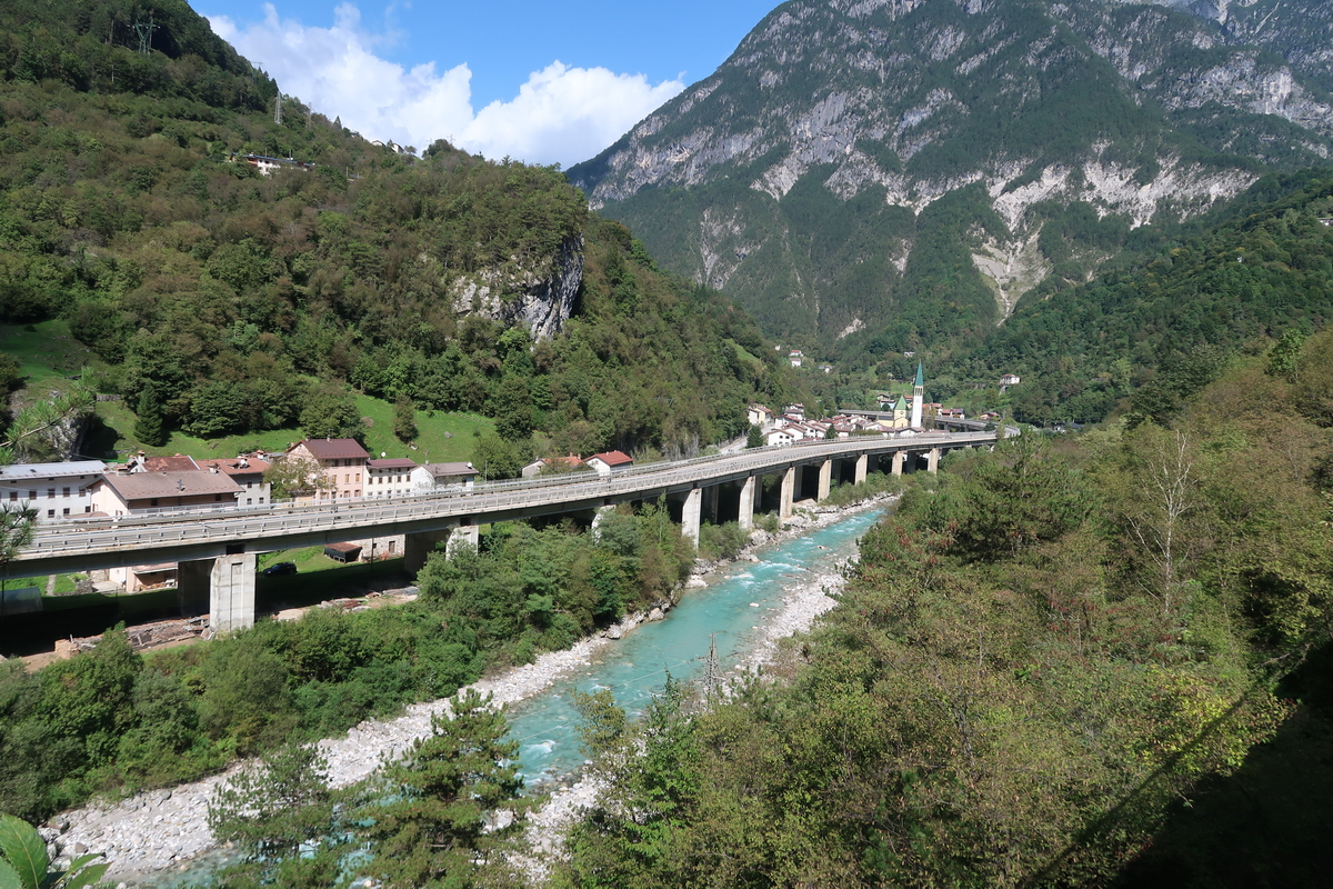 Als Beleuchtung wurden LED-Lampen installiert. Immer wieder fällt der Blick tief hinab ins Tal des Fella-Flusses, hier auf den Ort Dogna.