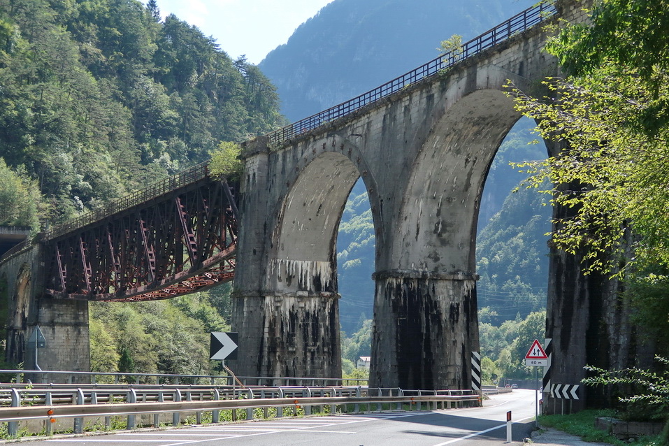 Das große Eisenbahn-Viadukt an der östlichen Tunnelausfahrt der SS13 bei Coccau erreicht man über eine Nebenstraße, die den Tunnel mit einer großen Schleife umgeht. Der Autotunnel ist für Radfahrer gesperrt.