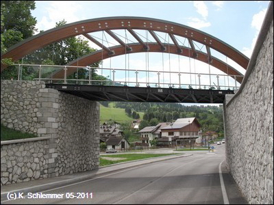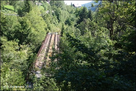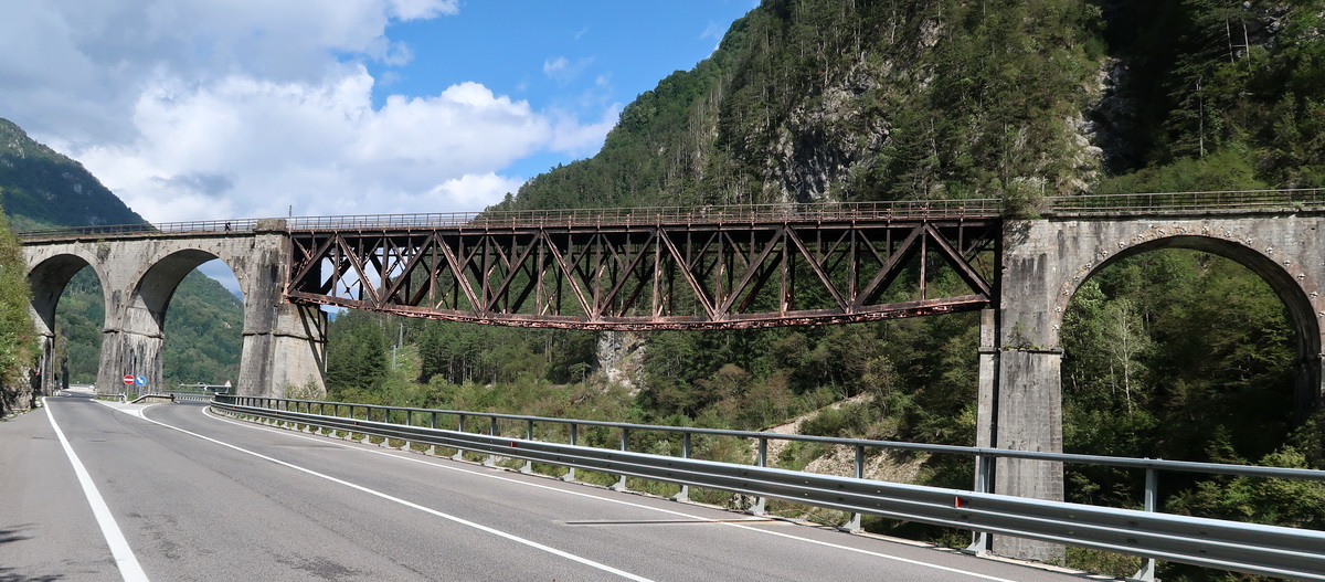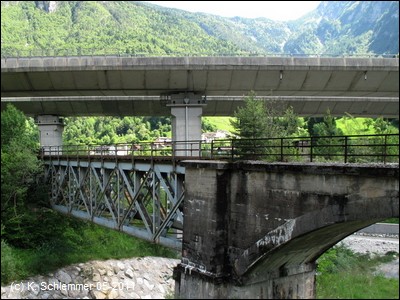 Brücke der alten Pontebbana über den Rio Tugliezza vor der Einmündung der alten Bahnstrecke am Bahnhof Carnia.