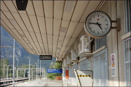 Unsere Fahrt beginnt am Bahnhof von Carnia. Der Ausbau auf der alten Trasse der Pontebbana beginnt 1,1 km weiter nördlich in der Via Somp Pave. Man folgt der Via Nazionale durch den Ort und unterquert nach einer Linkskurve die Schnellstraße SS13, die den Ort umgeht. Nur noch 250 m, dann biegt man nach links ab auf die Trasse (beschildert).
