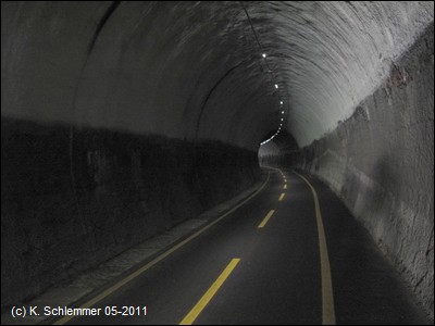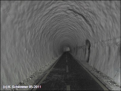 Der folgende Tunnel ist 650 m lang, die Beleuchtung funktionierte! Nach dem Tunnel folgt eine lange Gerade mit Stützmauer.