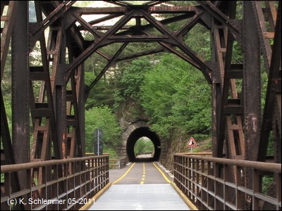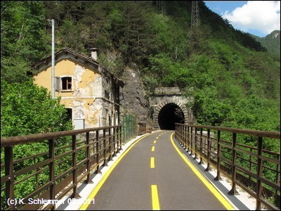 Der Bahntrassenradweg ist Teil des Alpe-Adria Radwegs von Salzburg nach Grado (ca. 410 km) und wird inzwischen von einigen kommerziellen Anbietern von Fahrradtouren genutzt, entsprechend häufig trifft man auch auf größere Radlergruppen. Auch Rennradler nutzen die Strecke. Auf dieser Webseite wird nur der Bahntrassenabschnitt beschrieben. Wir haben diesen Abschnitt erstmals 2011 befahren, damals waren noch mehrere Lücken vorhanden, teilweise im Ausbau. Zuletzt wurde der Abschnitt Resiutta - Carnia auf der Trasse fertiggestellt, in einem der Tunnel war 2025 die Beleuchtung im September 2025 defekt. Aus historischen Gründen beginnen wir die Fahrt am Bahnhof Carnia , etwa 1 km nördlich beginnt die asphaltierte Strecke auf der ehemaligen Bahntrasse. Seit 2011 sind einige Hindernisse beseitigt worden, weitere Tunnel wurden befahrbar gemacht und die Infrastruktur verbessert. Im Abschnitt Pontebba - Laglesie San Leopoldo wird zur Zeit ein weiterer Abschnitt auf der Trasse ausgebaut ( Jahr 2025, Umleitung eingerichtet!)