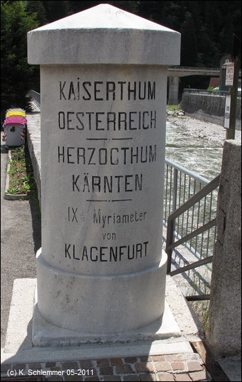 An der Brücke über den Fluss mitten im Ort stehen die alten Myriametersteine (10 km-Steine) der Grenze zwischen Italien und Österreich (bis 1918).