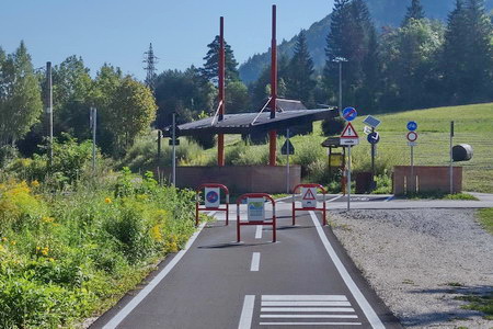 Unter der alten Signalbrücke durch erreicht man einen Rastplatz, an dem die Route nach Slowenien abzweigt (Bahntrassenradweg Tarvisio - Kranjska Gora - Mojstrana :"Kronprinz Rudolf-Bahn"). Auch wer zum Bahnhof Tarvisio Bosco Verde (aktuelle Eisenbahnstrecke) möchte, muss hier abbiegen. An dem kleinen Parkplatz am Bahnhof gibt es eine Unterführung zu den Gleisen und zu den Parkdecks auf der anderen Seite der Gleise.