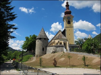 Blick auf die Kirche von Tarvisio (Tarvis). Die Wurzeln der Stadt reichen bis in die Römerzeit zurück. Der ehemalige Stadbahnhof Tarvisio Cittá liegt etwas südöstlich der Altstadt.